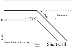 A trader who believes that a stock price will decrease, can sell the stock short or instead sell, or "write," a call. The trader selling a call has an obligation to sell the stock to the call buyer at the buyer's option. If the stock price decreases, the short call position will make a profit in the amount of the premium. If the stock price increases over the exercise price by more than the amount of the premium, the short will lose money, with the potential loss unlimited. The profit for the writer of a call option is