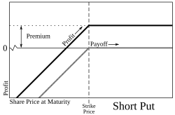 A trader who believes that a stock price will increase can buy the stock or instead sell, or "write", a put. The trader selling a put has an obligation to buy the stock from the put buyer at the put buyer's option. If the stock price at expiration is above the exercise price, the short put position will make a profit in the amount of the premium. If the stock price at expiration is below the exercise price by more than the amount of the premium, the trader will lose money, with the potential loss being up to the full value of the stock. A benchmark index for the performance of a cash-secured short put option position is the CBOE S&P 500 PutWrite Index (ticker PUT).