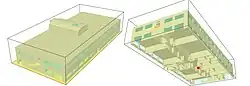 A three-floors university building is modeled. A 1500 kW fast fire is positioned at ground floor near the main entrance. The calculation domain is divided into three MESHs for parallel calculation. Round geometries are exported to FDS notation.