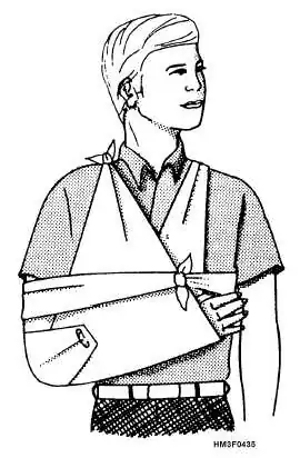 A splint and sling applied to the forearm. Note the second triangular bandage immobilizing the arm by holding it against the torso.