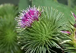 ![]() Arctium is an Old World genus whose biennial plants have been introduced around the world, perhaps in part due to Velcro-like burrs that promote wide seed dispersal. |