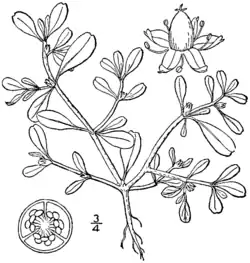 ![]() common purslane The origin of Portulaca oleracea is uncertain, but purslane seeds and the pollen of both purslane and corn were discovered in sediments at the bottom of meromitic Crawford Lake, a few miles west of Lake Ontario, indicating that both plants were present there prior to European settlement. It is thought that pre-Columbian people pulled the purslane from their corn fields and then washed it in the lake prior to cooking it.[3] Globally, P. oleracea is widely-naturalized and treated as a noxious weed in many locations.[4] Although Portulaca grandiflora is said to escape cultivation in North America,[5] the New York Flora Atlas lists it as not naturalized.