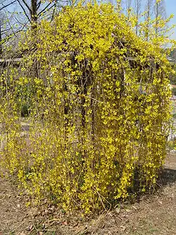 Forsythia is a popular non-native ornamental shrub, planted at least in part for its bright yellow early spring flowers. In New York, the degree of this popularity is tempered in much of the state where local weather doesn't consistently allow much flowering. The two species listed as having to some extent naturalized in New York are F. viridissima (greenstem forsythia) and F. suspensa (weeping forsythia). It's likely that in recent times the hybrid of the two, Forsythia × intermedia, has been planted at least as much as either of its parents, but it is sterile and also may not reproduce vegetatively as well as F. suspensa, whose arching branches root where they touch the ground, allowing it to do a slow walk into adjacent natural areas.[1]