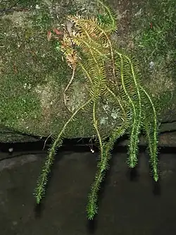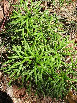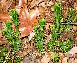 | The Huperzioideae, known as firmosses, have also been treated as a separate family Huperziaceae. Firmosses differ from other Lycopodiaceae in that they grow in clumps, instead of producing creeping, horizontal stems like other family members.[1] Of the three genera in this group, Huperzia is a temperate and arctic genus and is the only one found naturally in New York. Of the other two genera, Phlegmariurus is native to tropical and subtropical regions, and Phylloglossum is native to Australia and New Zealand.
