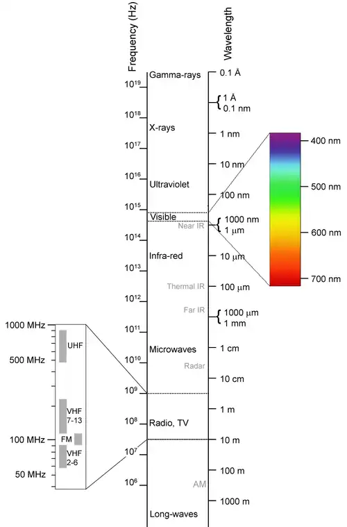 Light, or visible light, is a very narrow range of electromagnetic radiation of a wavelength that is visible to the human eye (about 400–700 nm), or up to 380–750 nm.[1] More broadly, physicists refer to light as electromagnetic radiation of all wavelengths, whether visible or not.