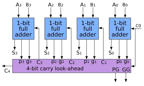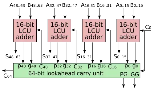 By combining multiple carry look-ahead adders even larger adders can be created. This can be used at multiple levels to make even larger adders. For example, the following adder is a 64-bit adder that uses four 16-bit CLAs with two levels of LCUs.