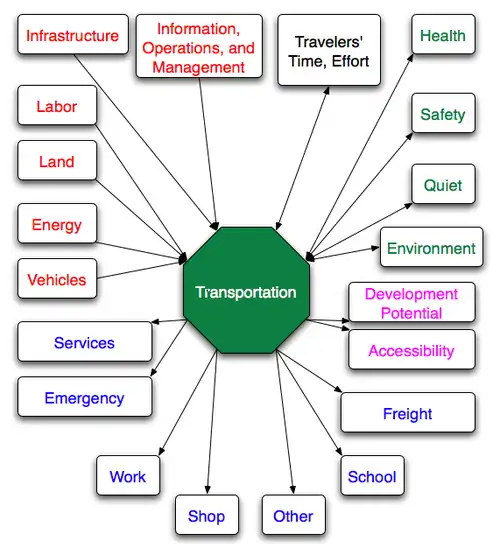 Figure 1 illustrates the inputs, outputs, and outcomes of transportation. In the upper left are traditional inputs (infrastructure including pavements, bridges, etc.), labor required to produce transportation, land consumed by infrastructure, energy inputs, and vehicles). Infrastructure is the traditional preserve of civil engineering, while vehicles are anchored in mechanical engineering. Energy, to the extent it is powering existing vehicles is a mechanical engineering question, but the design of systems to reduce or minimize energy consumption require thinking beyond traditional disciplinary boundaries.
