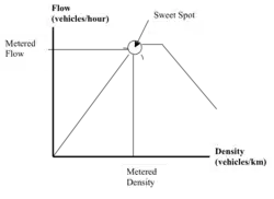 Metering has other objectives, including the break-up of platoons entering freeways. Limiting the number of vehicles that enter the freeway all at once increases the likelihood of each vehicle finding a suitable gap into which it can merge, thus decreasing the likelihood of shockwaves being generated at freeway on-ramps.