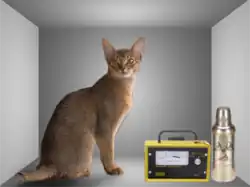 - A cat is placed in a sealed box. Attached to the box is an apparatus containing a radioactive nucleus and a canister of poison gas. This apparatus is separated from the cat in such a way that the cat can in no way interfere with it. The experiment is set up so that there is exactly a 50% chance of the nucleus decaying in one hour. If the nucleus decays, it will emit a particle that triggers the apparatus, which opens the canister and kills the cat. If the nucleus does not decay, then the cat remains alive. According to quantum mechanics, the unobserved nucleus is described as a superposition (meaning it exists partly as each simultaneously) of "decayed nucleus" and "undecayed nucleus". However, when the box is opened the experimenter sees only a "decayed nucleus/dead cat" or an "undecayed nucleus/living cat."