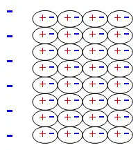 A charged rod is brought near the surface of the crystal. {Note: the rod is not shown, just the charges on it}. The electrons in the atoms try to get away from the negative charge because they are repelled. The positive charges in the nucleus try to get nearer to the negative rod because they are attracted to it. The result is the atom slightly changes shape. The center of the negative charges goes to the right of the center of the atom and the center of the positive charges goes to the left. We say there is a separation of charges