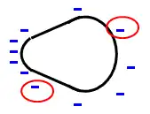 | The charge spreads out on this uneven conductor unevenly. The two electrons that are circled in red cannot see each other. The body of the conductor gets in the way and shields them. This is why the charges congregate around the highly curved areas. |