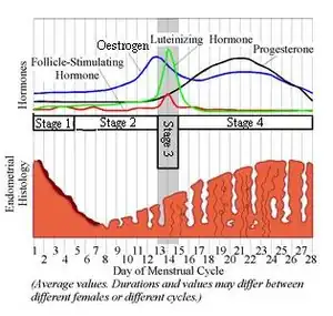 Stage 1. Days 1-4. Menstruation (bleeding) occurs. The lining of the uterus disintegrates and is shed. This is due to low levels of progesterone.