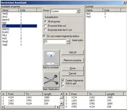 The list on the right shows the contents of the "restriction cocktail", the enzymes already selected for cutting. The resulting fragments for these enzymes together are shown in the lower right list. The enzyme selected in the left list can be put in the cocktail via Add to cocktail; all enzymes from the left list can be added at once via Add all. An enzyme can be removed from the cocktail by selecting it in the right list, then via Remove enzyme.