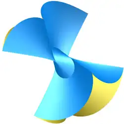 An algebraic surface that includes an oloid in the center. The rendering uses different colors for the two sides of the surface.