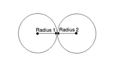 Let's take a look at what happens when two spheres are touching. The image shows , the radius of each sphere now also defines the distance its center to the opposite sphere's skin. The interspace between the centers would be equal to radius1 + radius2. If the distance would be greater, the two spheres would not touch but if it would be less, the spheres would intersect.