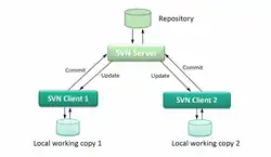 The concept of a Subversion system is that a repository is hosted on a server and accessed by different SVN Clients through the SVN Server. Each client can checkout a working copy, work on it and submit the changes to the central repository (commit). All the other clients can then update their working copy so it is always synchronized with the newest version in the central repository.