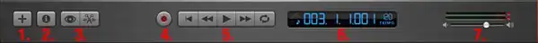 - Use these buttons to move through your song. The first button will place the cursor at the start of your project. There are 'back' and 'forward' buttons that move the cursor either one measure back or forward. The middle button is the 'play' button. The last button can be used to loop certain sections. Feel free to try it out but this tutorial won't explain this function.