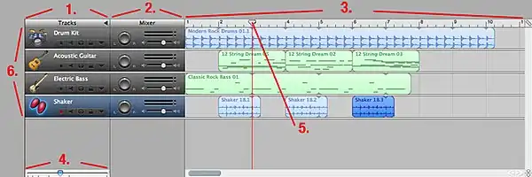 - This is the cursor. This is from where GarageBand plays back your song when you press "play". Reposition it to make the song play from a different place or use the buttons in the 'buttons bar' below.