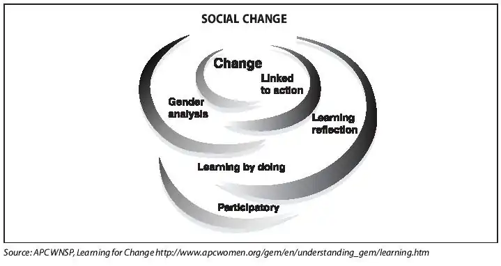 Social change as illustrated by APC WNSP below (Figure 3), includes critical reflection, implying the self and self-transformation. The element of self/self-transformation is a critical element as it relates to the personal self (as individual) and the human self (as social construct), as well as the stakeholders/audience of a particular ICT intervention. The changes that happen to the ‘self’ and how the ‘self’ affects other components are central to the gender analysis of ICT interventions. Like gender, the ‘self’ has different roles and responsibilities that can be evaluated and seen in different ways.