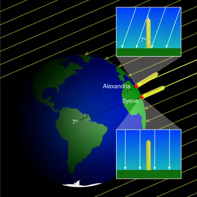 In the third century BC, the Hellenistic Egyptian scholar Eratosthenes served as head of the library of Alexandria, where he studied and wrote on a variety of subjects. During his studies, Eratosthenes learned that the Sun cast no shadow on midday of the summer solstice from the city of Syene. From Alexandria, Eratosthenes observed that the Sun did cast a shadow, and he measured that the angle between the Sun and the zenith was about seven degrees when the Sun was highest in the sky.