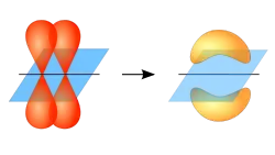 The second, and equally important kind of overlap is between two parallel p orbitals. Instead of overlapping head-to-head (as in the sigma bond), they join side-to-side, forming two areas of electron density above and below the molecule. This type of overlap is referred to as a pi (π, from the Greek equivalent of p) bond. Whenever you see a double or triple covalent bond, it exists as one sigma bond and one or two pi bonds. Due to the side-by-side overlap of a pi bond, there is no way the atoms can twist around each other as in a sigma bond. Pi bonds give the molecule a rigid shape.