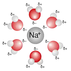 When sodium chloride is added to water, it will dissolve. Water molecules are polar, and sodium chloride is ionic (which is very polar). The positive ends of the water molecules (the hydrogens) will be attracted to the negative chloride ions, and the negative ends of the water molecules (the oxygens) will be attracted to the positive sodium ions. The attractions are strong enough to separate sodium from chloride, so the solute dissociates, or breaks apart. The solute is then spread throughout the solvent. The polar water molecules prevent the ions from reattaching to each other, so the salt stays in solution.