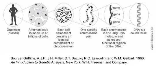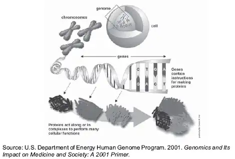 Each cell in an organism has one or two sets of the basic DNA complement, called a genome. The genome is itself made up of one or more extremely long linear array of molecules of DNA that are called chromosomes. Genes, as explained earlier, are the functional regions of the DNA. They are the active segments of the chromosomes.7 Figure 3 shows how the genome, chromosomes, DNA and genes relate to each other: