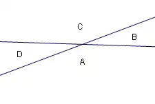 In the above diagram, A and C are vertical angles, and B and D are vertical angles. Vertical angles are congruent.