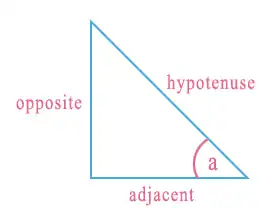 Notice that the bottom-left angle is 90 degrees. The sides labelled "opposite" and "adjacent" are the legs, and the names are in reference to the angle "a". These terms will always be used when discussing sides of a right triangle, and will always be given in reference to some angle. Remember, the hypotenuse is always the longest side and is always across from the right angle.