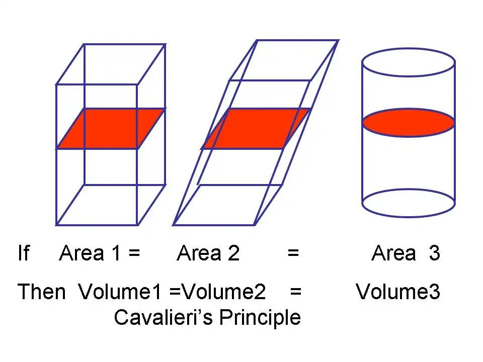 If two solids are contained between two parallel planes and every plane parallel to these two plane has equal cross sections through these two solids, then their volumes are equal.