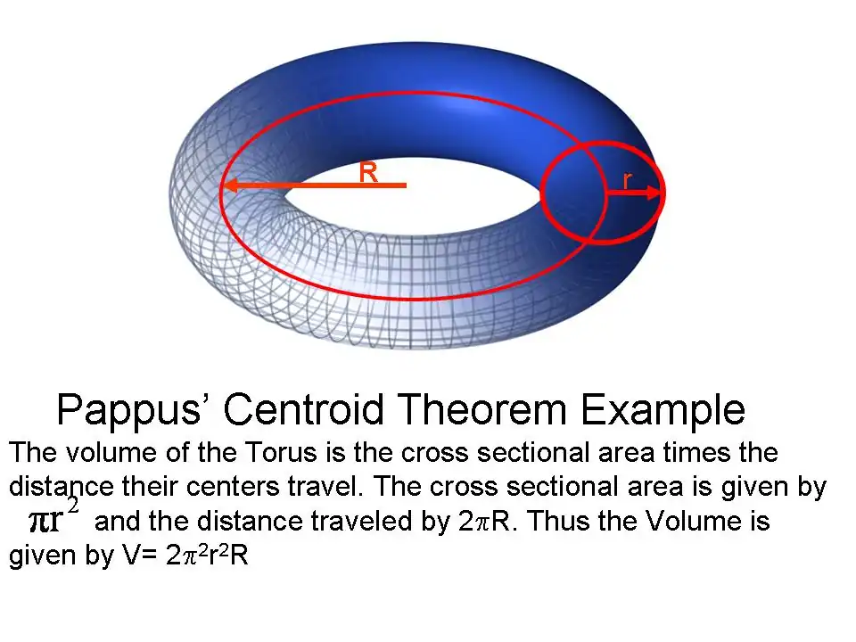 The volume of any solid whose cross sectional areas are all the same is equal to that cross sectional area times the distance the centroid(the center of gravity in a physical object) would travel through the solid.