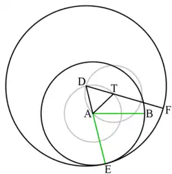 We use the notation for the circle whose centre is the point A and its radius length equals that of the segment .