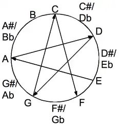 DADGAD (pronounced as a word: "DAD-gad"), one of the most versatile tunings, is named after the tuning of its strings. The sixth, second, and first strings are dropped two semitones to D, A, and D. Strumming all the strings open forms a Dsus4 chord; fretting the second fret of the third string (or muting the third string) produces a D5 chord, or D power chord. Most songs for DADGAD are in D major, or in G major with a capo at the fifth fret. Jimmy Page of Led Zeppelin played Kashmir in this tuning.
