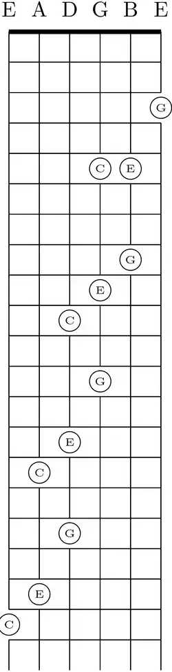 [[Image:First and second inversions of C-major chord on six-string guitar with major-thirds tuning.png|right|thumb|alt=The C major chord and its first and second inversions. In the first inversion, the C note has been raised 3 strings on the same fret. In the second inversion, both the C note and the E note have been raised 3 strings on the same fret.|Chords are inverted by shifting notes three strings on the same fret.