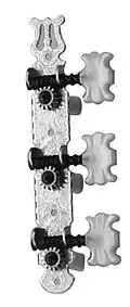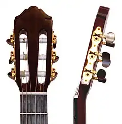 The strings are tensioned by means of tuning pegs, also known as tuners, tuning machines, or machine heads. A high gear ratio gives smoother, easier tuning but is not essential. A guitar can be tuned successfully even with fairly cheap tuners. Most guitar tuning problems originate in other areas, especially string sticking in the nut slots, and dirty or worn strings.