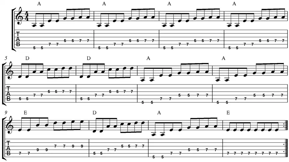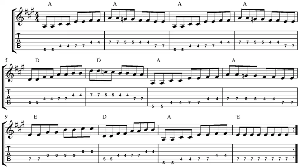 This exercise is a twelve bar blues shuffle in A. Observe that the lower note in each bar is always an open string and will be one of the roots of the primary chords I, IV or V.