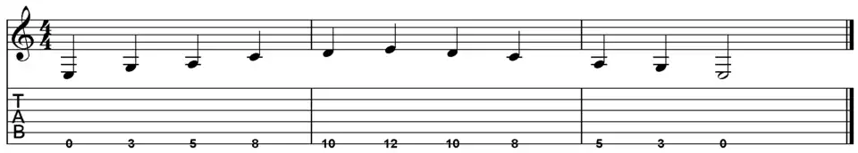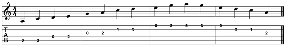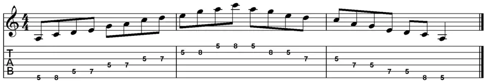 The minor pentatonic scale is a five note scale. It can be derived from the natural minor scale by omitting the second and sixth which in this exercise are the notes B and F. The notes of the A minor pentatonic scale are:
