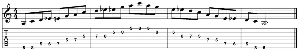 The blues scale below is the A minor pentatonic scale with the addition of a flatted fifth. The addition of the diminished fifth introduces an element of dissonance and tension to the scale. In this exercise the flatted fifth blue note acts as a chromatic passing note which resolves to a consonance. Observe that you always refer to the scale degrees of the minor pentatonic scale by the interval names of the natural minor scale. The fourth note of the scale below retains the designation of a fifth whether it is diminished or perfect. The omission of the second and sixth note of the natural minor scale to form the minor pentatonic scale does not alter the interval relationship between the A and E which remains a perfect fifth.