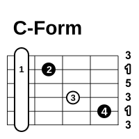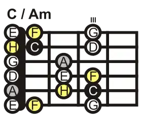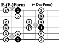 The number "1" indicates the position of the root note of a major scale. (German) the position of the barre chords, will help you find the root notes. You discover the root of the major scale by looking for the semitone steps.