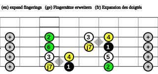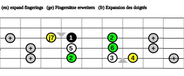 We use the above-mentioned extension for the (German) 3-Notes-Per-String Scales (3NPS for short), which opens up further possibilities for us. (Especially the (German) Sweeping).