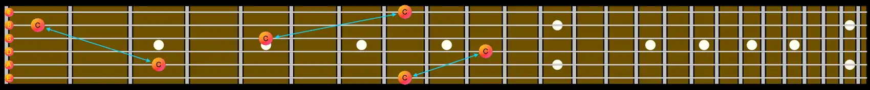 Using octaves is a useful way of reinforcing melody lines. When a melody is played simultaneously at different octaves; the ear interprets it as a single melodic voice. Octave lead playing stands out and is not that difficult to master. Any melody you know can be expanded to include octaves. The diagram below shows three octave pairs of the note C. All are movable and once grasped can be incorporated into your playing with ease. Wes Montgomery was a jazz guitarist who made octaves his trademark and his influence is heard in the work of the guitarist George Benson.