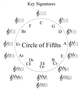 The name "circle of fifths" refers to the interval between the root note of each successive scale in the clockwise direction.