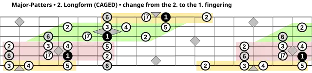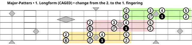 Here all major patterns are shown in comparison to each other in the common 3 scale concepts. We are roughly based on the C major scale.