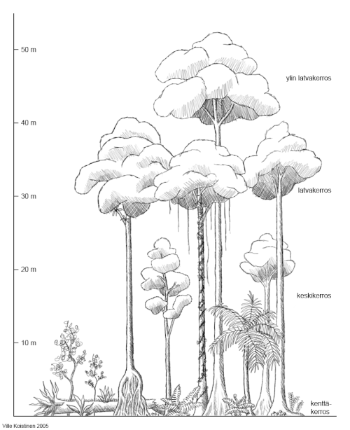 • Canopy layer: The second layer, 30-40 m above the ground. Trees are continuous.