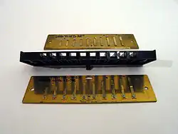 No matter what kind of harmonica, they are always made up of five basic parts: a comb (also known as body), which is made of plastic, wood or metal, and contains the air channel, as well as supporting the reed plates (or sandwich the comb), which have the reeds blots on to it. This sandwich is further sandwiched by two coverplates, which provide a place to grip the harmonica, as well as producing the aural quality.