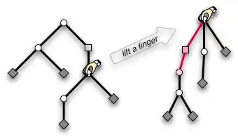 Now, the context is a series of steps each of which chooses a particular subtree among those in . Thus, the unchosen subtrees are collected together by the one-hole context . The hole of this context comes from removing the subtree we've chosen to enter. Putting things together, we have