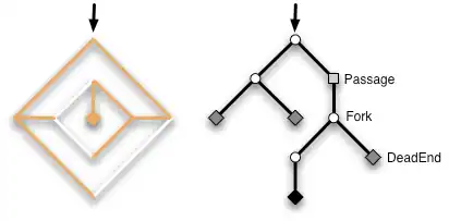 "Most importantly, TurnLeft and TurnRight have a sub-labyrinth glued to them. When the player chooses say to turn right, we extend the thread with a TurnRight and now attach the untaken left branch to it, so that it doesn't get lost."