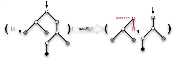 turnRight :: Zipper a -> Maybe (Zipper a) turnRight (t, Fork x l r) = Just (TurnRight x l : t, r) turnRight _ = Nothing
