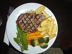 The meats and poultry food group includes red meat, chicken, fish, eggs as well as nuts, legumes and beans.The Australian Guide to Healthy Eating recommends that meats are trimmed from fat and that meat makes up approximately a quarter to a third of a meal. It is also recommended that 19-50 year old males consume 3 serves and females 2.5 serves from this food group per day.