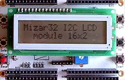 When talking with the LCD display over I2C, the Mizar32's I2C bus must be set to a speed no faster than 50kHz. If the Mizar32 talks with other I2C devices at speeds up to 100kHz, this will not confuse the LCD display: it is able to recognise its own address (and reject all other addresses) at up to 100kHz but can only process data packets at a maximum of 50kHz.